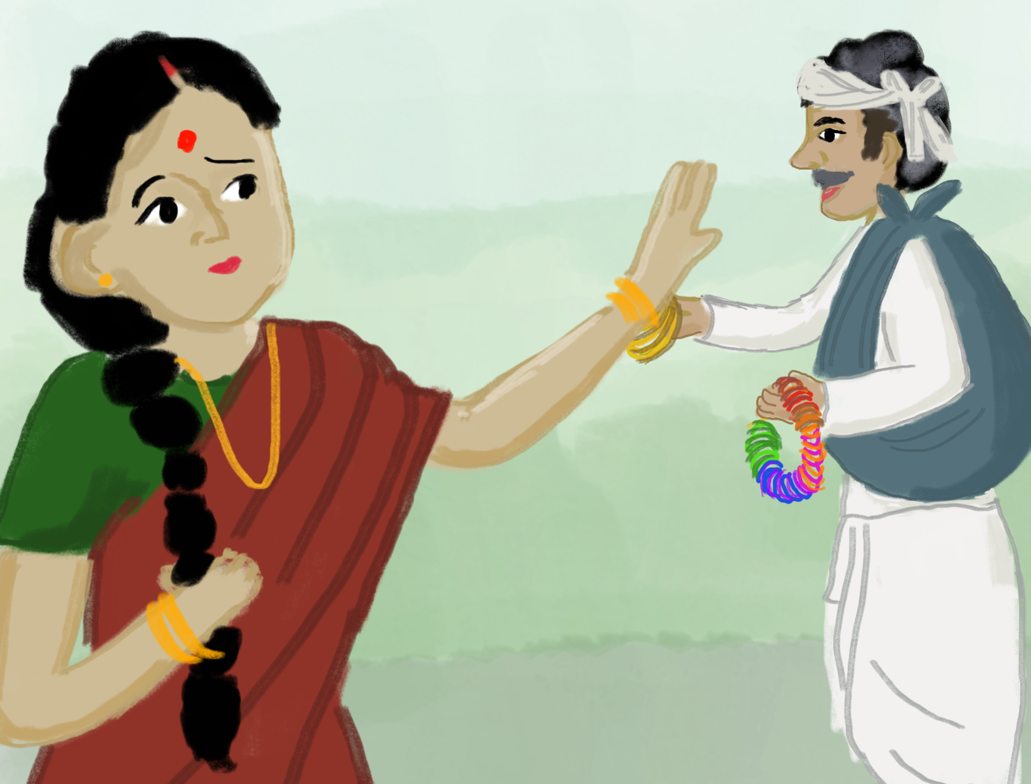 The central character ‘Rukmini’ sends a message to her maternal home, with a bangle seller passing by the way. When the messenger reaches her parents’ home, they are all busy with their routine work and chores. So they tell him that they will respond after they finish their engagements. But when the messenger goes up to her brother, he doesn’t waste a second. He delegates all his work to others  and immediately rushes to see his dear sister and address her grievance. Rukmini is overwhelmed to see her brother coming. She warmheartedly welcomes him but he could immediately spot the sadness in her eyes. When asked, she tells her brother that she has been given all the things in dowry except a butter churner and  because of that she is ridiculed by those at her matrimonial home. Her  mother-in-law  jibes at her, the co-sisters and sister-in-laws tease her. Hearing this, the neighbour ladies too join in and nod in assent.